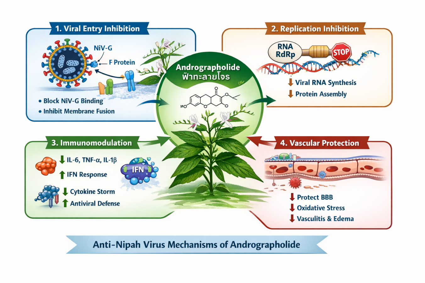 ภาพที่ 2 แสดงกลไกที่เป็นไปได้ของสาร andrographolide ซึ่งมีอยู่ในสมุนไพรฟ้าทะลายโจรที่ยับยั้งและลดอาการของการติดเชื้อไวรัสนิปาห์ ได้แก่ 1.ยับยั้งไวรัสเข้าเซลล์ผ่านการจับโปรตีนบนผิวเซลล์ 2.รบกวนการทำงานของเอนไซม์ที่ใช้ในการเพิ่มจำนวนไวรัส 3.ลดการหลั่งสารกระตุ้นอักเสบและกระตุ้นกลไกการป้องกันไวรัสนิปาห์ 4.ช่วยป้องกันไวรัสผ่าน blood brain barrier ลด oxidative stress และหลอดเลือดอักเสบ